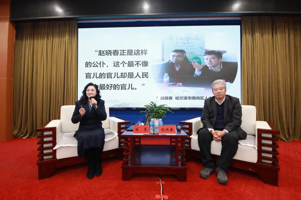 在访谈教学环节,校(院)马克思主义学院院长陈晨教授与哈尔滨市南岗区人大一级调研员、省委党校兼职教师赵晓春同志围绕提升群众工作能力展开深入交流。赵晓春同志结合自身长期基层工作经历,生动讲述了创办哈尔滨市春晓农民工家长学校的历程,从亲身工作经历总结的“28个一”群众工作实践方法出发,分享如何提升党员干部群众工作能力。