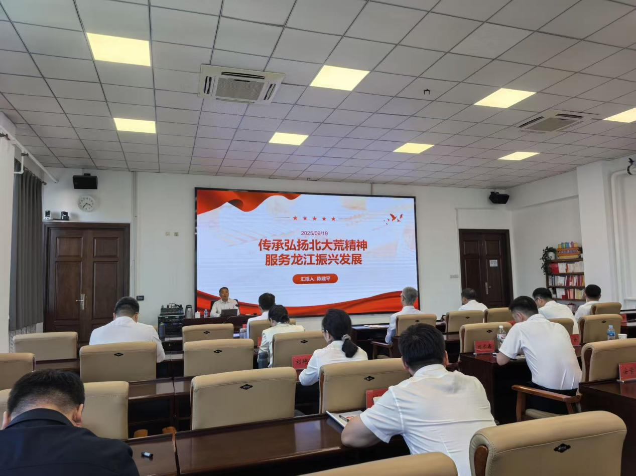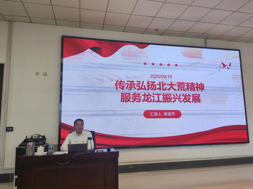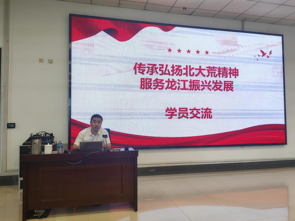 活动在庄重热烈的氛围中拉开帷幕。中青班学员临时党支部书记陈建平以《传承弘扬北大荒精神,服务龙江振兴发展,争做担当龙江振兴发展重任的中青年骨干》为题为全体学员讲授思政课和党课,紧紧围绕北大荒精神的历史传承、核心内涵、时代价值和实践要求,从“北大荒精神历史传承、北大荒精神核心内涵、新时代传承弘扬北大荒精神、凝聚龙江振兴的磅礴力量、牢记习近平总书记的嘱托”五个方面,系统解读了“自力更生、艰苦创业、勇于开拓、甘于奉献”的北大荒精神形成历程、时代价值和实践意义。通过大量生动案例和数据,深情回顾了北大荒开发建设者们用青春、热血甚至生命书写的光辉篇章,深刻阐释了北大荒精神作为中国共产党人精神谱系重要组成部分的丰富内涵。