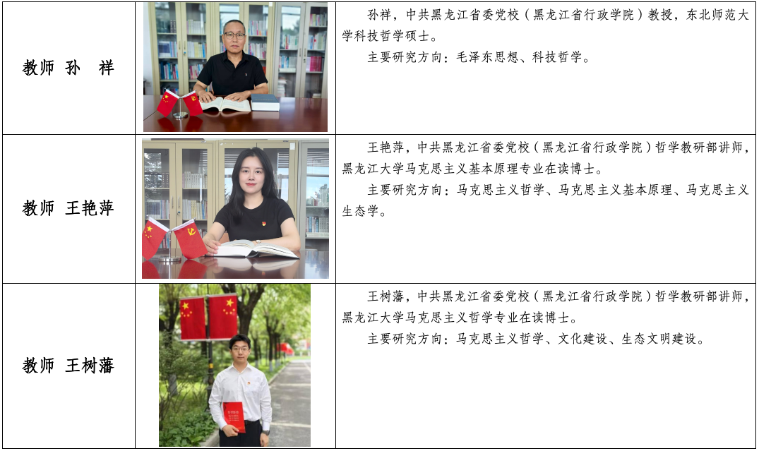 哲学教研部现有教师9人,其中,专职教师8人,秘书1人;博士后3人,博士4人,硕士3人(在读博士2人)。在校委的正确领导下,在历任主任的带领下,哲学教研部在教学、科研、决咨工作方面取得了优异成绩。自2009年以来,国家课题共立项9项,省课题多项,教学专题多次在主体班获奖,教学竞赛成绩优异。