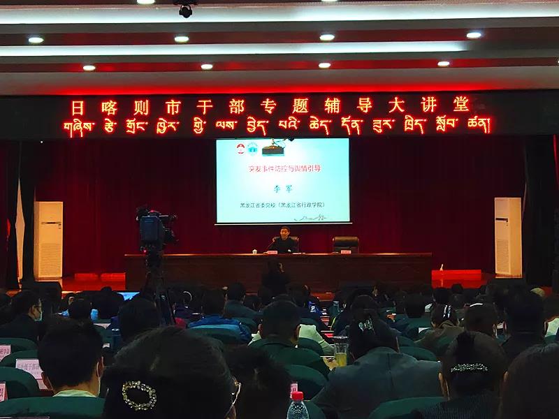 2021年6月17日,领导科学教研部李军教授,作为校(院)名师工作室首席专家,受黑龙江援藏工作队的安排与西藏自治区日喀则市委党校的邀请, 为日喀则市广大干部作了题为“突发事件防控与舆情引导”的专题讲座,从深刻认识突发事件、国家应急管理方略、突发事件实际防控、重视舆情引导与掌控三个方面,详细阐述了突发事件的特征类别以及如何做好管控和舆情应对,为领导干部在遇到突发事件时做好相关管控工作指明了方向,并得到当地领导干部广泛好评。