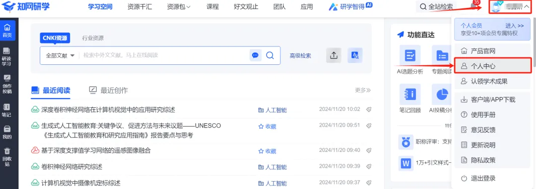 开通账号后,单位人员可在知网研学平台(x.cnki.net)右上角“个人用户中心”,选择“关连机构”,绑定本单位开通的研学资源账号。